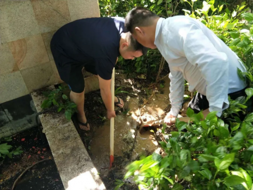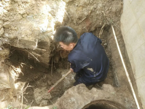 在日常巡查发现小区配电箱旁自来水主管道漏水的情况后,中奥物业的工程人员立即赶过去,将水阀关掉,进行排查流水口。将水阀关掉之后,将流水处进行排查是否水管破裂,将流水处地面深挖找到水管。确定是最底层主管道破裂了,整个排查工作需要对地面挖至约2米深才能找到地下主管道。
