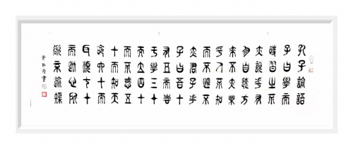 篆书作为一种古老而庄重的书体,承载着中华民族千年的文化积淀。在文化复兴的全新时代里,黄映元先生的篆书艺术不仅具备极高的文化弘扬价值,还拥有极强的装饰性,能够美化现代人的生活环境,成为当代美学的琼花玉蕊。黄映元先生的篆书以穿越时空的文化使者,将传统艺术之美引入现代文化生活空间,使人们能够感受到古典的宁静高雅。《书论》亦论:夫书者,玄妙之技也,若非通人志士,学无及之。黄映元先生的作品,以通人之法与志士之功为加载,不仅能够装点居室增添文化气息,还能陶冶人们的文化情操,使心灵得到净化升华。
