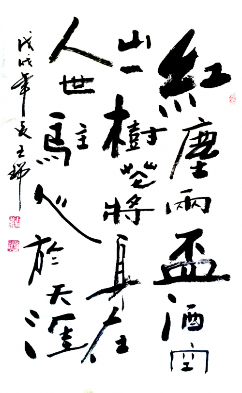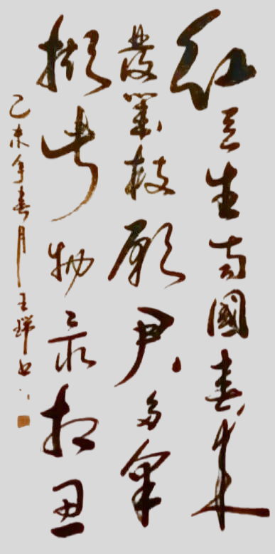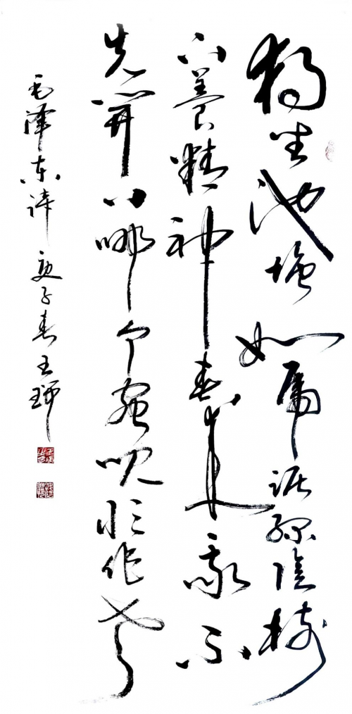 王瑞的书法堪称一绝。其书作雄浑苍茫、气势磅礴、思与神合、具有抽象笔墨意味的经典之作,他以丰厚人生阅历和学识修养为底蕴,以臻于化境的笔墨功夫作支撑,一破此前的因袭摹古和法度束缚,因心造境,以手运心,写书法以神遇而不以目视,足见王瑞的艺术功力和成就非同一般。在笔法上也达到了前无古人的境界,层层深厚,气势磅礴,惊世骇俗,这一显著特点,也使中国的书法上升到一种至高无上的境界。王瑞,敷色不多,他清楚,黑白二色,表达的亦是一虚一实一动一静,相生相发,相反相成,是中国传统文化的一种深刻表现。