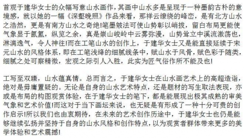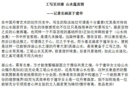 于建华,苏州人,毕业于江苏教育学院学前教育系。现为:中国美术家协会会员,江苏省美术家协会会员,中国工笔画学会会员。师恩钊北派山水工作室画家、研究员:圣融美术院画家、助理导师,北派山水师恩钊工作室特聘画家,北京圣融美术院画家助理导师,北京一方画院特聘画家。14年一15 年进修于清华美术学院高研班,师从师恩钊,罗金保,张津诚等。