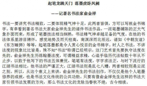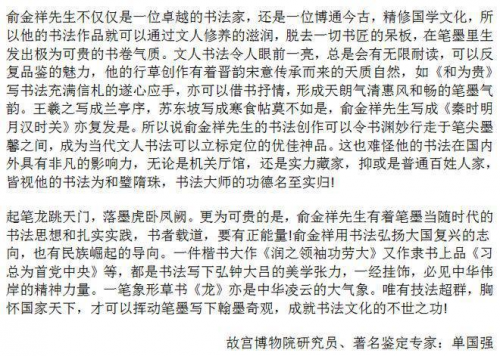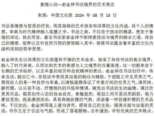 俞金祥,字石人,1934年出身于浙江省嵊州市殿前村,刘海粟先生再传弟子。从事书法美术教育五十多年。所创作品,笔墨传统过硬,构思奇特,布局疏密有致。开创书法创新新格局,为中国传统书法艺术之花输液、添彩、增光。其作品笔墨精妙、别开生面、自成一家,深受业界同仁认可。虎字2012年在法国卢浮宫展出7天,作品多次在海外十多国展出,“龙”、“虎”、“和”选为国礼赠送外国政要,荣获“国际艺术泰斗”称号。俞金祥《两岸一家亲》作品有中华收藏家协会(台湾)收藏,同时荣获“台北故宫国际艺术奖”。被中国文学艺术界联合会评为《国家特级书画家》。2023年,被评为中国国宾礼艺术家。主要入编有:中国艺术档案出版社出版的《中国传承大师》、东方华夏文化遗产保护中心编制的《华夏遗产·艺术之巅》、中国文艺出版社出版的《当代书史一一名家经典作品范本》,2024年出版的《中国书法全集》的封面设计采用俞金祥的作品!俞金祥的头像与作品多次作为封面人物刊载于经典性的书画合集中。个人出版有《俞金祥三体书法集》被定为孔子学院书法辅导教材,纪念“一带一路”倡议十周年《俞金祥个人专集》。2024年出版《中国美术教育名师名作教学范本一一俞金祥书画作品选集》。2024年11月参与“一带一路·美美与共国际艺术交流展”2022年6月央视华夏儿女栏目组、华夏儿女传承艺术之星评选组委会特授予俞金祥《“华夏儿女》-优秀艺术传承之星”荣誉称号,2022年8月中国民族艺术品牌领航人物组委会、电视《文化强国》栏目组特授予“民族艺术品牌领航人物”荣誉称号,同年又荣获“吉尼斯世界艺术终身成就奖”,授予“吉尼斯最具收藏价值艺术家”荣誉称号。