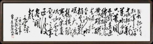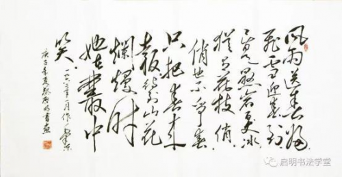 如要说隶书是碑学的造诣,行书是帖学的收成,那么他的草书则是才华的灵赋。草书作为书法抒情的最高境界,向来对个人才华性灵要求极高,只有磨砺功,没有性灵风,草书不可写,写亦成呆板。观赏蔡启明先生的草书,会被生动多趣的线条艺术所折服,用纵横恣睢的笔触,写天下无物非草书的体验,铁画银钩,笔墨淋漓,尽是癫素神采。最为可观的是,他的草书除了笔墨天然的性灵观感,还有因碑入草的神奇,碑草一体,形成了姿纵天歌,苍茫琢崖的独特风尚。