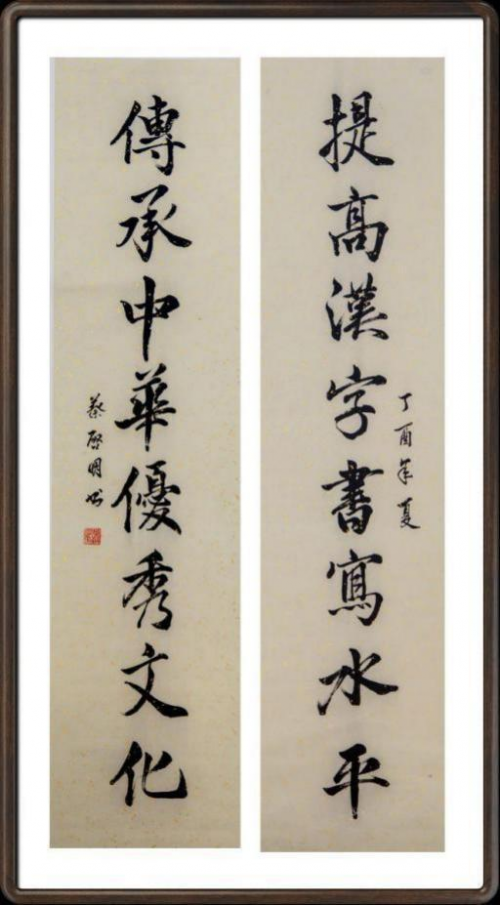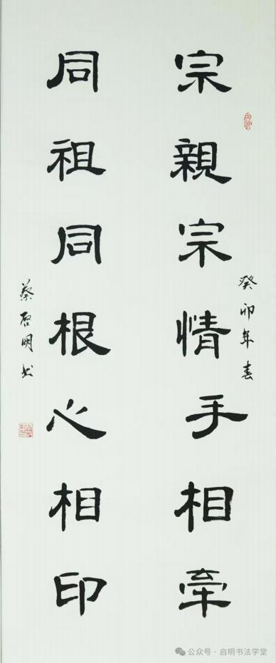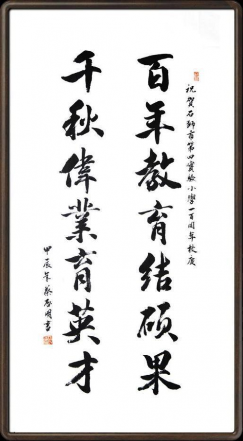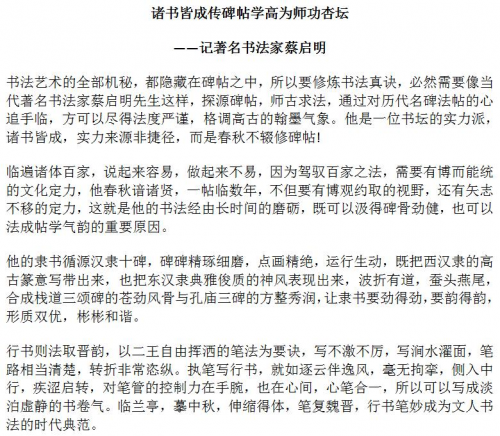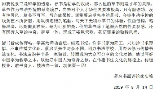 诸书皆成传碑帖,学高为师功杏坛。纵观书坛,许多书家为匠工,只知抄书求形似,不事传播文化职。蔡启明先生与众不同,创办书法学校,用杏坛修为传播书法文化,书法造诣并非是一家独益,转而成为大众可分享的文化功德,他以写好中国字为教学之本,以做好中国人为修身之核,在传播书法文化的路径上,传道授业,教书育人,技法高一筹,功德晋一品!