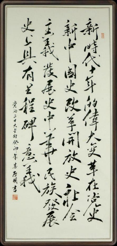 2020年8月,以习近平新时代中国特色社会主义思想和党的十九大精神为指导,深入贯彻党中央关于文艺工作的决策部署,牢牢把握以人民为中心的工作导向,坚持“二为”方向和“双百”方针,本人入编由中国楹联学会特编撰《联墨名家代表作大观》,编撰以坚持植根传统、鼓励创新、艺文兼备、多样包容的创作理念。