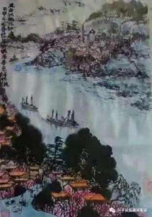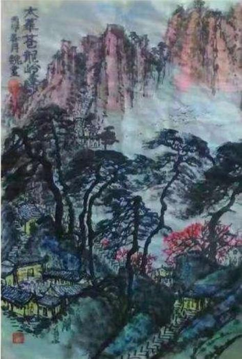 主题山水画的杰出代表作品,另有《风声水起北部湾》《冠头岭一带一路的起点》两幅作品 , 除去笔墨无可挑剔 , 景致至美至优之外 ,其精神风貌也是笔系国运 ,墨拥国策 ,雄山长水寄托了对中国一带一路国家战略的高度认同 ,观画识国运 ,知国策 ,都是政治主题与山水风景融生家国情怀的杰出作品 ,魏伯川作为一名艺术家 ,是心有政治责任感的人 ,他操笔墨 ,跳出了小文人自愉的小圈,高屋建瓴,胸怀家国,放眼世界,是富有爱国主义情怀的人民艺术家。在绘画技艺上,魏伯川先生不但精通施墨,还精通油画施彩技法。其代表作品《华岳松骨傲千秋之华岳棋亭》将油画的油彩写实风格融入中国山水,山体明 ,更有雄浑气势,松枝凝硬更具挺拔意象,此技法东西融通,被魏伯川先生使用到风起水生 , 随心所欲的地步。 图中定睛之景为华岳棋亭,代表中华民族的精神,寓意自然且深。另附七言绝句一首:东峰脚下有奇景,满弓射向天门中。峻俏秀美绝无路,天降雲梯到仙亭!这首诗是魏伯川先生登华山东峰看日出,夜观华山棋亭有感,情景交融,体现了魏伯川先生心有诗意胸有才华的文学涵养,另有善施彩墨的代表作品《江南新貌》 ,施墨除了富有中国画浓淡相宜,如云如烟的特点之外,