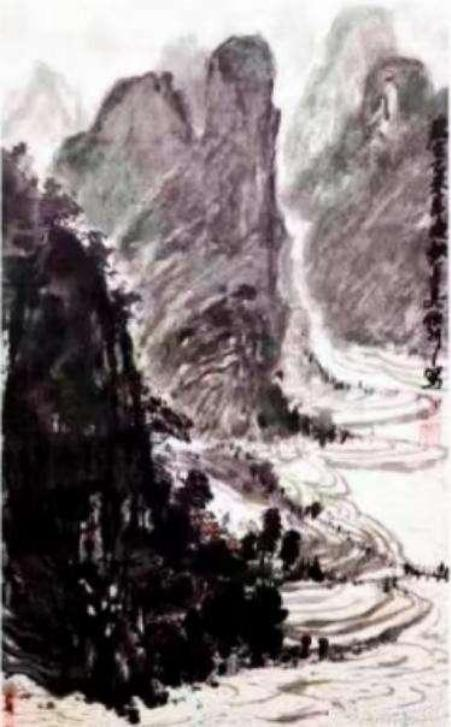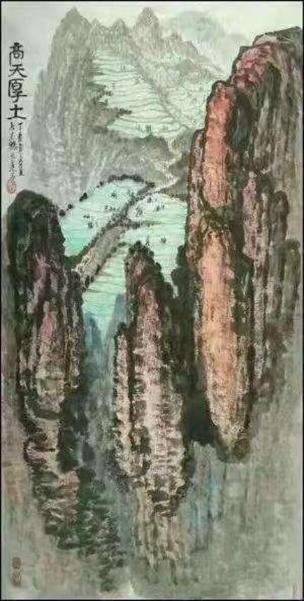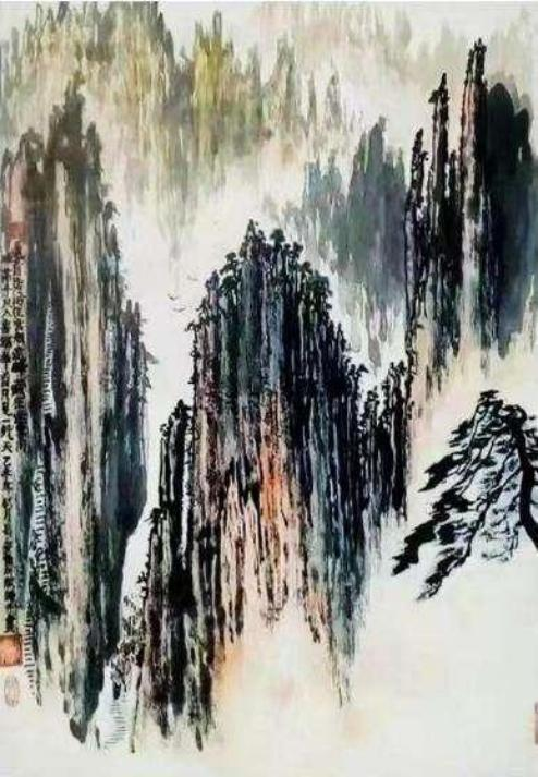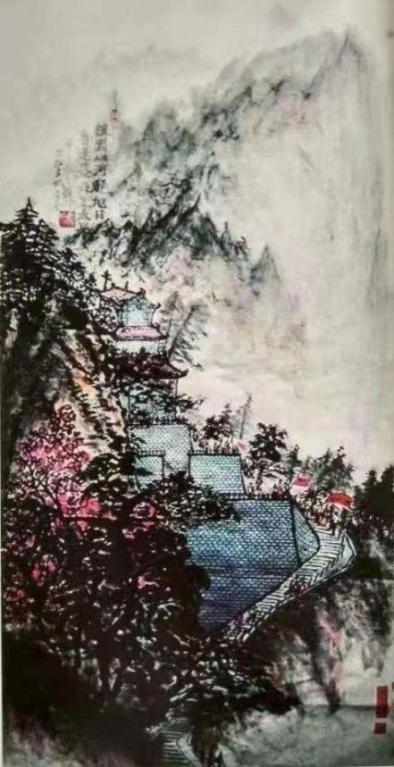 山水在他的笔墨里 ,必是人格精神化的表现!对境造意,善骨法用 笔,有勾勒山体岩崖的钢铁铁铸。通过落笔钧直的皴擦 ,让每一根线条不断结组成云上山巅的精神浩莽!笔笔相生,绝不松懈。写意山水必是歌颂时代精神的主题塑造。所以他的山水不作小文人画的造作,而是长安画派志写高远的气派!再参意岭南画的色墨无碍 ,通过赏心悦目的水墨铺陈和色彩渲染 ,让山水格外苍润 ,有精神亦有气韵。正是应物象形 ,随类赋彩的佳作。